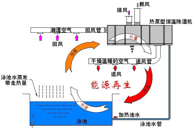 系统利用蒸发器中回收游泳池散发的热量,通过压缩机作功再经过回热冷凝器给空气回热,亦可经过池水冷凝器给池水加温。